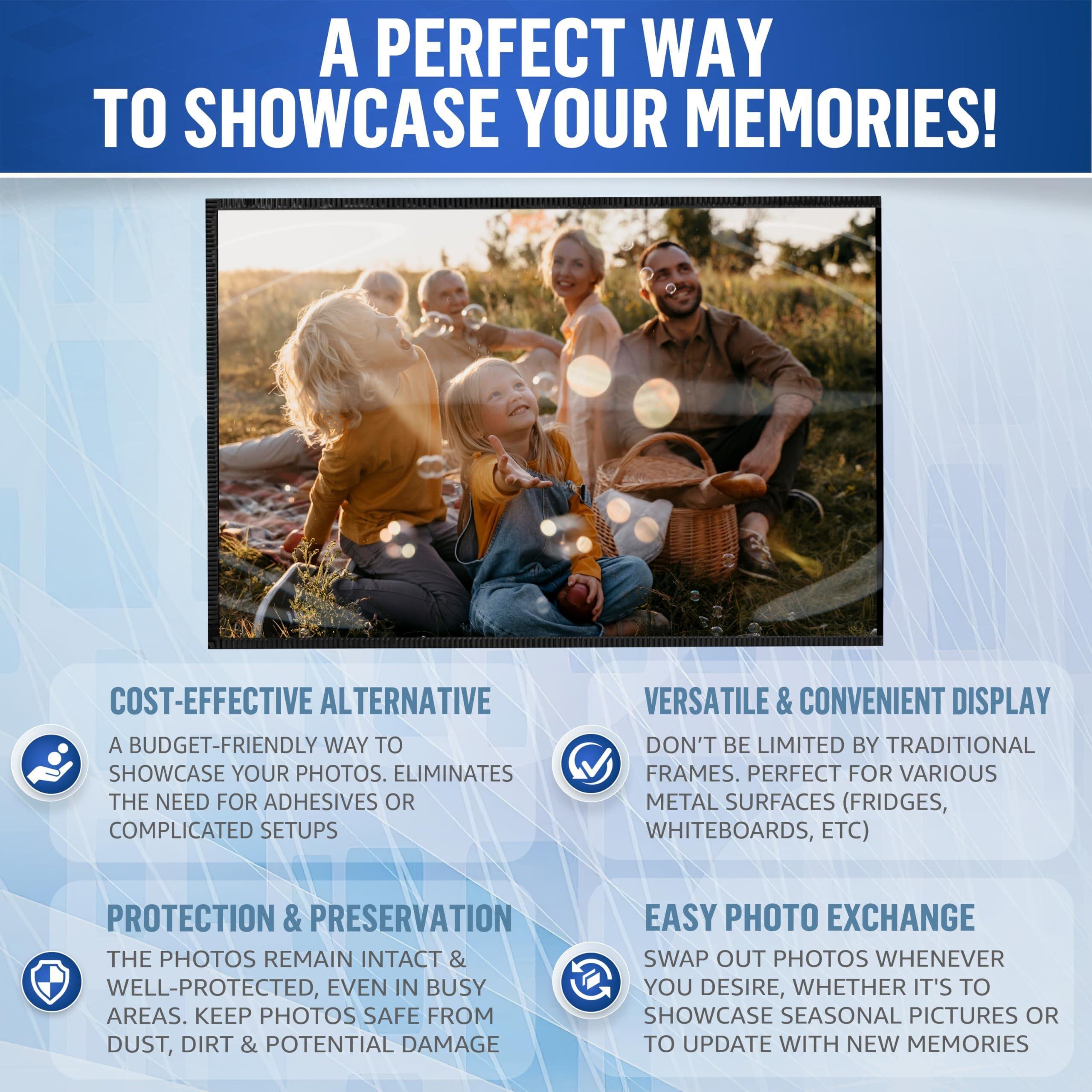 5.wide applications - whether at home or in the office, with our photo sleeves magnetic you can easily showcase your photos or documents on any metal surface. from refrigerators, metal cabinets & doors to whiteboards, the possibilities are endless.