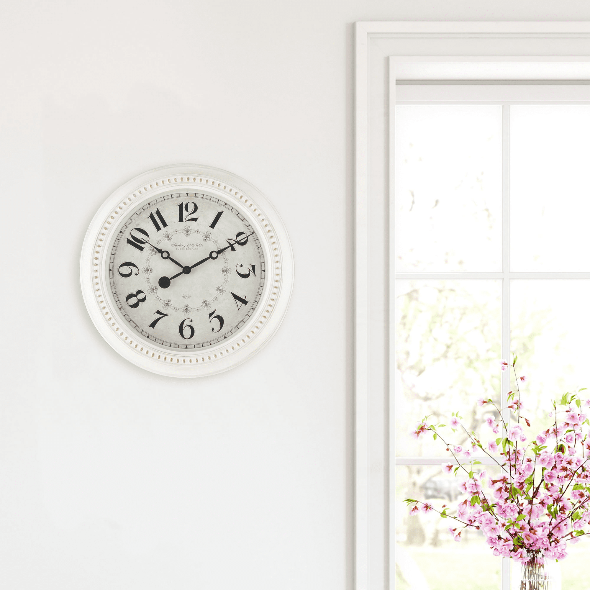 Add farmhouse charm to your home with this lovely mainstays 15.5" white wall clock! The clock's dial is encompassed with a beautiful beaded bezel frame, featuring a warm, vintage-white finish that is hand applied. The base of the finish is white and is topped with warm-toned brushstrokes. The lovely parchment style dial continues the vintage farmhouse styling with its traditional arabic numbers and outer minute track, along with a printed decorative 'fleur-de-lis' motif ring at the center of the dial. The hour and minute hands feature a unique shape and are finished in satin black, making them visible against the dial. A glass lens protects the dial and handset. The clock's quality quartz movement ensures precise timekeeping. A diameter of 15.5' makes this clock’s size substantial enough to be hung upon a wall on its own, but small enough to be hung alongside your existing wall décor should you like as well! The culmination of this wall clock’s decorative accents makes this wall clock full of charm, one that would bring such decorative flair to any home!